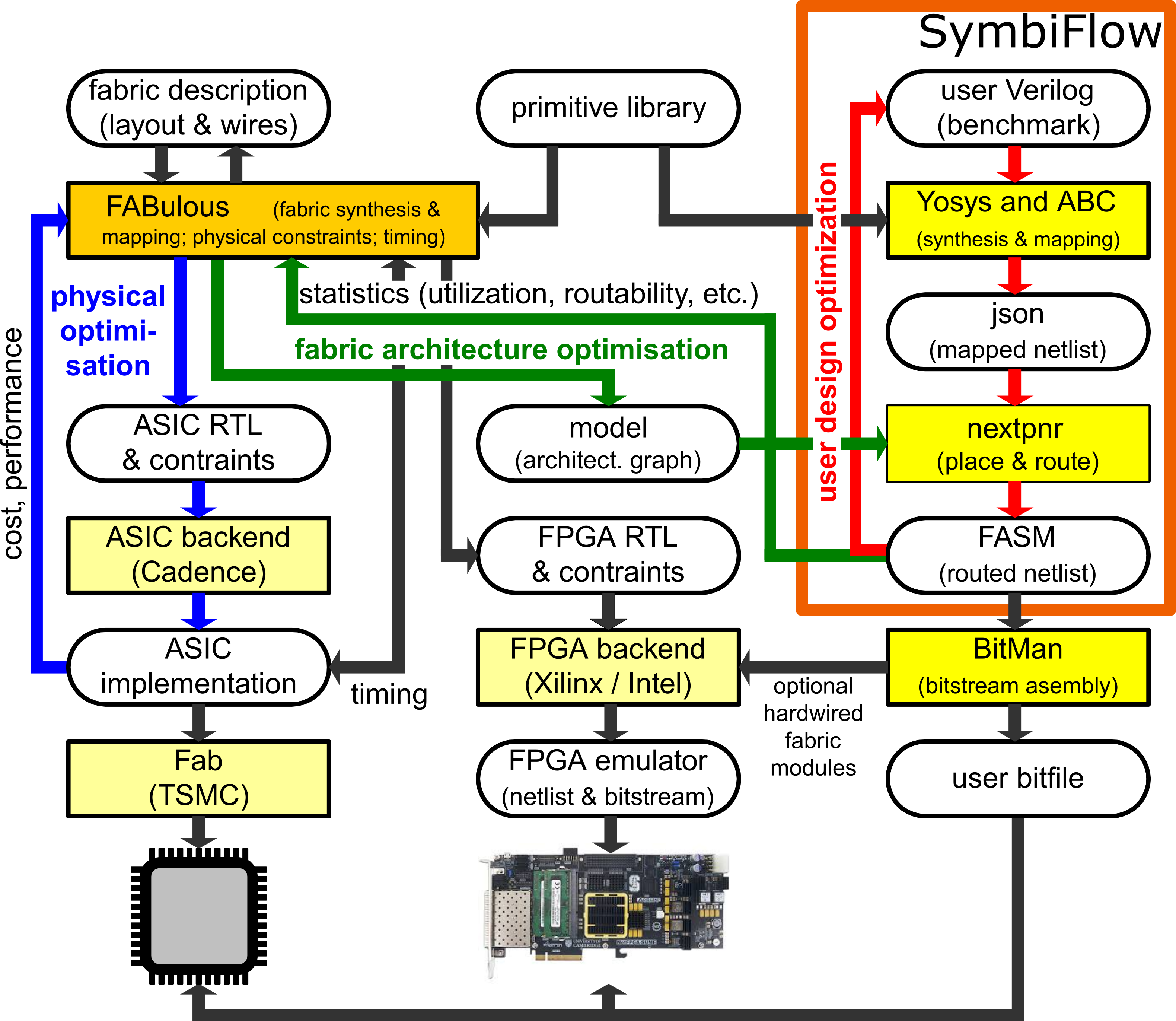 The FABulous ecosystem generates the embedded FPGA fabric for chip fabrication and integrates other widely used open-source tools like Yosys and nextpnr. It also deals with the bitstream generation and after fabrication tests. Additionally, we will provide an emulation and simulation setup for system development.