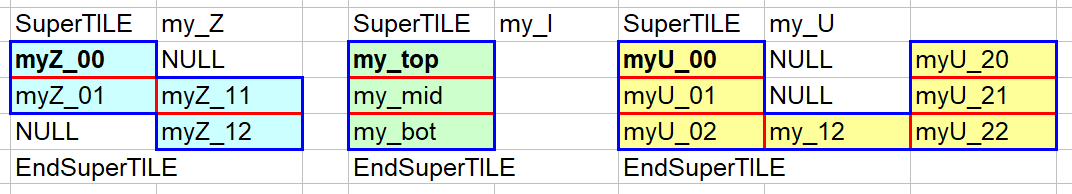 Supertiles are modelled from elementary tiles in a supertile.csv file similar to how we model the whole FPGA fabric. Shapes can be defined arbitrary and NULL tiles can be used to skip fields. Examples: